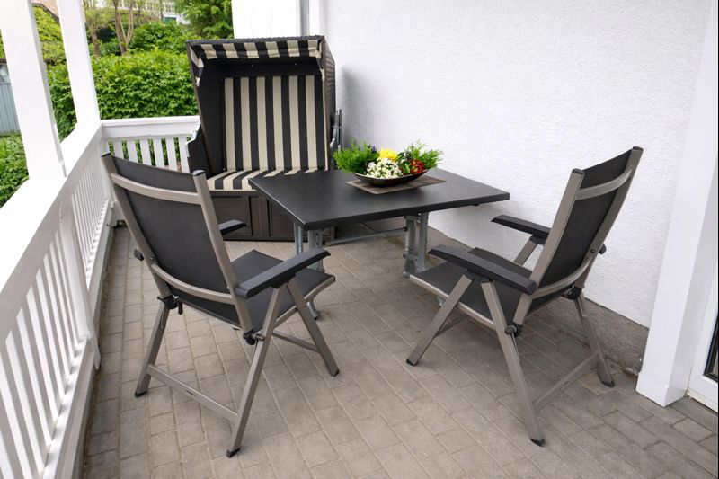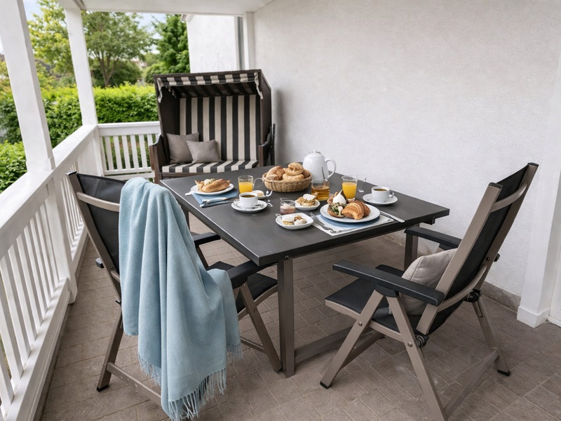 Auf der Terrasse stehen Gartenmöbel und Strandkorb zum Entspannen für Sie bereit.