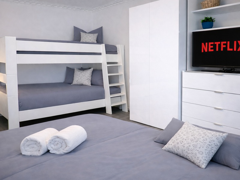 Im großen Schlafzimmer befinden sich ein Boxspringbett, ein Etagenbett und ein großer Schrank mit integriertem Flachbildfernseher.