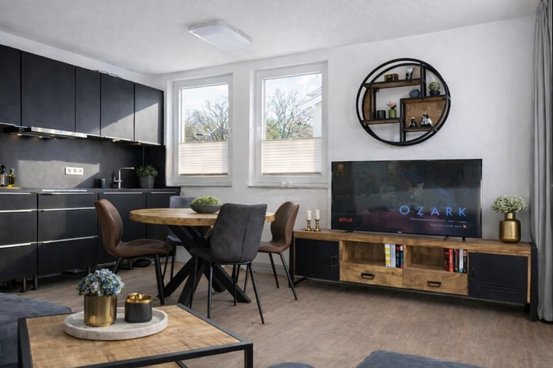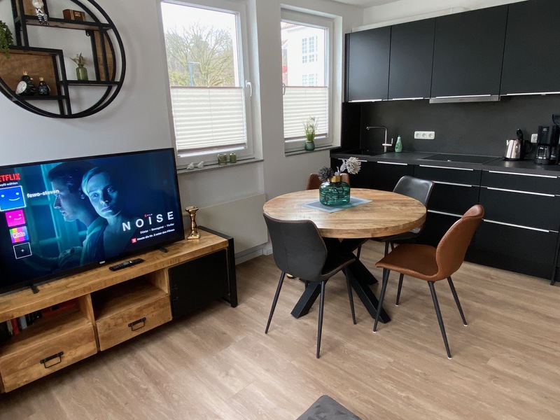 Die Nichtraucherwohnungen bestehen aus einem großen Wohnzimmer mit einem bequemen Schlafsofa, einem großen Fernseher, einen DVD-Player sowie einem Esstisch.
